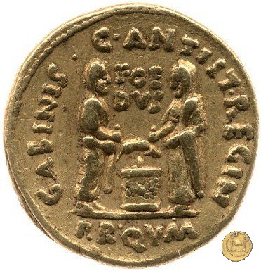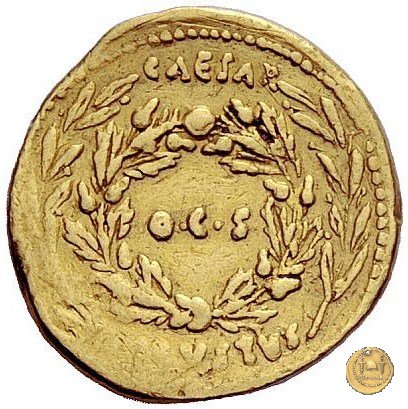 CLM123 Dritto: ![]() CAESAR ![]() AVGVSTVSTesta di Augusto, laureata di quercia, rivolta verso destra. Verso: ![]() C ANTIST REGIN; → FOE / DVS; → P R QVM (esergo); ![]() GABINISDue sacerdoti velati, uno di fronte all'altro, con in mezzo un altare, sopra il quale stanno sacrificando un maiale. | |