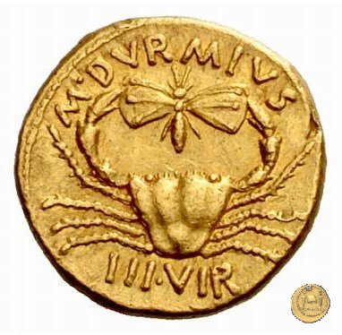 CLM115 Dritto: ![]() CAESAR ![]() AVGVSTVSTesta di Augusto, laureata di quercia, rivolta verso destra. Verso: ![]() M DVRMIVS ![]() IIIVIRUn granchio che afferra una libellula. | |