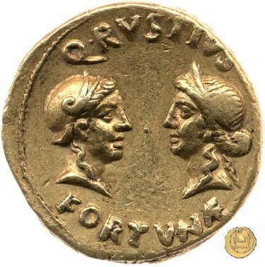CLM116 Dritto: ![]() Q RVSTIVS ![]() FORTVNAEA sinistra la testa della Fortuna Victrix, rivolta verso destra e con elmetto, a destra, la Fortuna Felix, diademata e rivolta verso sinistra. Verso: ![]() CAESAR - I ![]() AVGVST - O; → S CUna Vittoria, che vola verso sinistra, che poggia uno scudo iscritto su di un cippo. | |