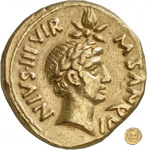 CLM118 Dritto: ![]() AVGVST DI ![]() VI F LVDOS SAEUn araldo, elmato, rivolto verso sinistra. Con la mano destra tiene un caduceo alato e con la sinistra uno scudo con una stella iscritta. Verso: ![]() M SANQVI ![]() NIVS IIIVIRTesta giovanile (Giulio Cesare oppure il Genio Saecuili Novi), laureata, rivolta verso destra. Sopra, una stella cometa con quattro raggi e una coda. | |
