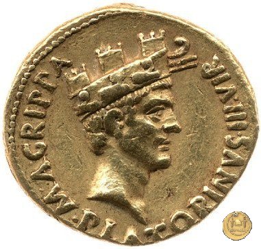 CLM122 Dritto: ![]() CAESAR ![]() AVGVSTVSTesta di Augusto, laureata di quercia, rivolta verso destra. Verso: ![]() M AGRIPPA ![]() PLATORINVS IIIVIRTesta di Agrippa, con una corona di mura e rostri, rivolta verso destra. | |