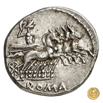 317/3 - denario L. Appuleius Saturninus Dritto: Testa di Roma a sinistra, con elmo attico alato. Verso: L. SATVRN Saturno su quadriga verso destra; tiene le redini con la mano sinistra, un falcetto (l'harpa) con la destra. In alto o in basso una lettera di controllo. | |