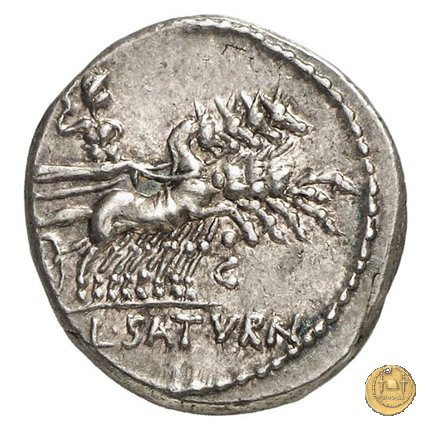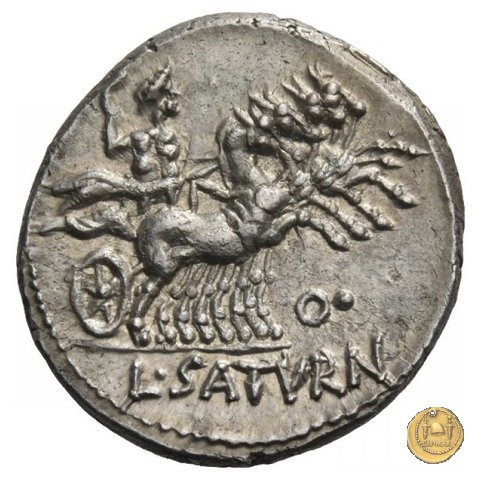 317/2 - denario L. Appuleius Saturninus Dritto: ROMA Saturno su quadriga verso destra; tiene le redini con la mano sinistra, un falcetto (l'harpa) con la destra. Verso: L. SATVRN Saturno su quadriga verso destra; tiene le redini con la mano sinistra, un falcetto (l'harpa) con la destra. In basso una lettera di controllo. | |