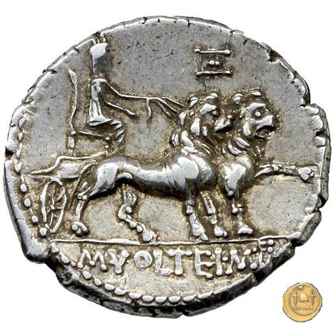 385/4 - denario M. Volteius M.f. Dritto: Busto drappeggiato (Attis?) a destra, con elmo ornato da una corona d'alloro. Dietro un simbolo di controllo. Verso: M. VOLTEI. M. F Cibele in trono su biga di leoni verso destra, con velo e con corona turrita; tiene le redini con la mano sinistra, la patera con la destra. In alto un numero di controllo. |