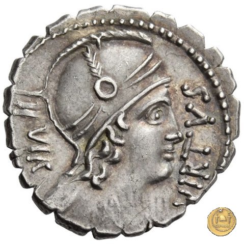 401/1 - denario Mn. Aquillius Mn.f. Mn.n. Dritto: VIRTVS - III. VIR Busto drappeggiato della Virtus a destra, con elmo crestato ornato sulla calotta di una piuma. Verso: MN . AQVIL - MN . F - MN . N - SICIL Guerriero stante con testa volta a destra; tiene lo scudo con la mano sinistra e solleva con la destra una donna inginocchiata. |