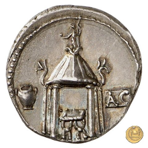 Reverse: Tempio di Vesta: edificio a sei colonne con cupola circolare, sormontato da una statua femminile velata (Vesta) con scettro e patera. All'interno una sedia curule. A sinistra un'urna votiva; a destra una tavoletta con inciso: A C