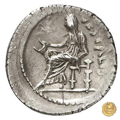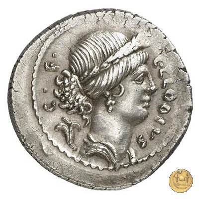 512/2 - denario C. Clodius C.f. Vestalis Obverse: C. CLODIVS - C. F Busto drappeggiato di Flora a destra, con corona di fiori e di foglie. Dietro un fiore (a forma di giglio). Reverse: VESTALIS Figura femminile seduta a sinistra; tiene il culullus con la mano destra. |