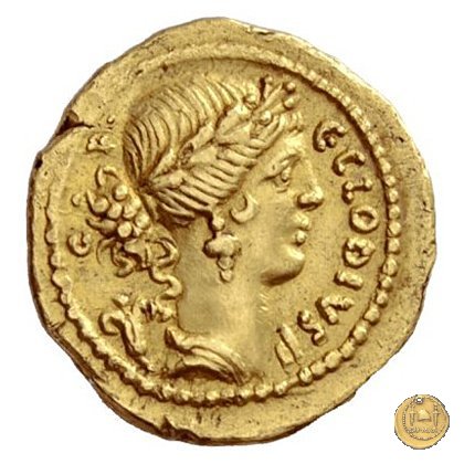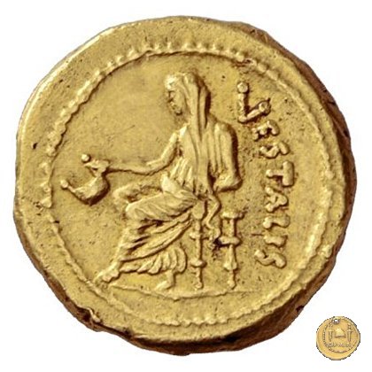 512/1 - aureo C. Clodius C.f. Vestalis Obverse: C. CLODIVS - C. F Busto drappeggiato di Flora a destra, con corona di fiori e di foglie. Dietro un fiore (a forma di giglio). Reverse: VESTALIS Figura femminile seduta a sinistra; tiene il culullus con la mano destra. | |