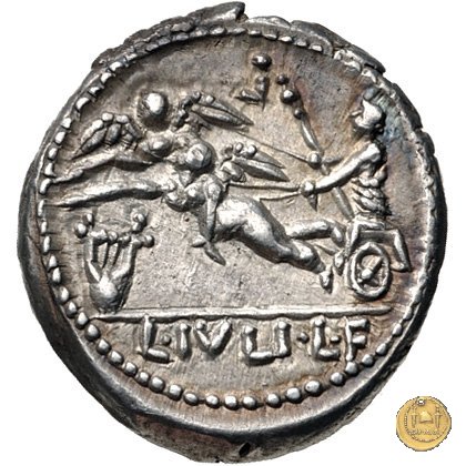 320/1 - denario L. Iulius L.f. Sex.n. Caesar Obverse: CAESAR Testa di Marte a sinistra, con elmo attico crestato ornato sulla calotta da una piuma. In alto una lettera di controllo. Reverse: L. IVLI. L. F Venere su biga trainata da due Cupidi in volo verso sinistra; tiene lo scettro con la mano destra, le redini con la sinistra. In alto una lettera di controllo. In basso una lyra. |