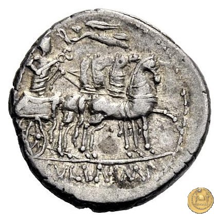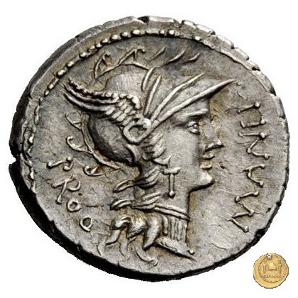 367/1 - denario L. Manlius L.f. Torquatus / L. Cornelius Sulla Felix Obverse: L. M - ANLI. PRO. Q Testa di Roma a destra, con elmo attico alato. Reverse: L. SVLLA. IMP(E) Triumphator su quadriga al passo verso destra; tiene le redini con la mano sinistra, un caduceo con la destra; viene incoronato dalla Vittoria in volo. | |