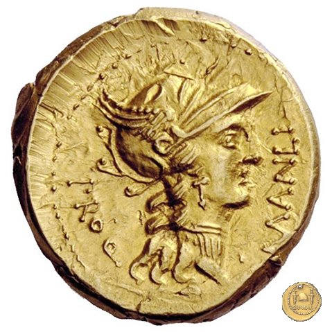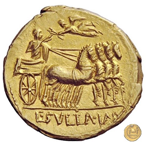367/2 - aureo L. Manlius L.f. Torquatus / L. Cornelius Sulla Felix Obverse: L. MANLI T - PRO. Q Testa di Roma a destra, con elmo attico alato. Reverse: L. SVLLA. IM(P) Triumphator su quadriga al passo verso destra; tiene le redini con la mano sinistra, un caduceo con la destra; viene incoronato dalla Vittoria in volo. | |