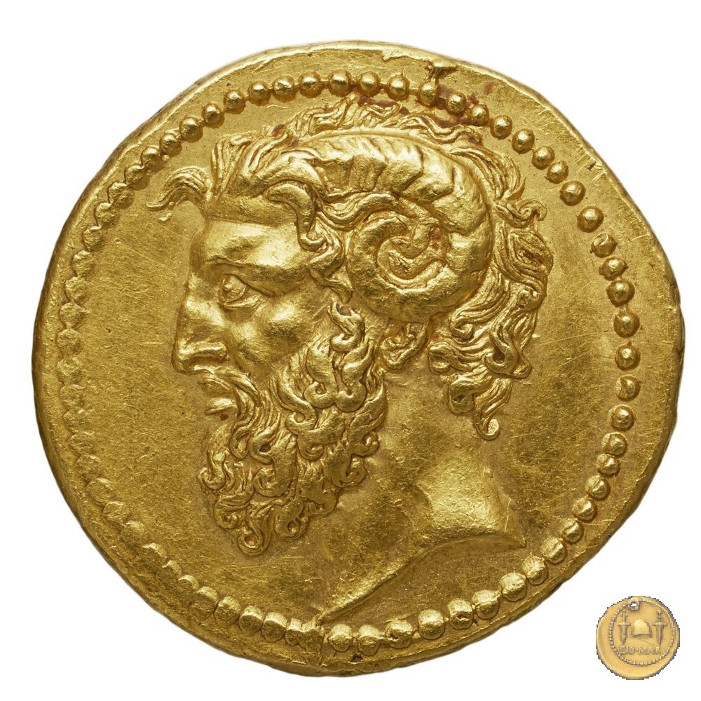 509/1 - aureo Q. Cornuficius Obverse: Testa di Giove Ammon a sinistra, con le corna di capro. Reverse: Q. CORNVFICI. AVGVR. IMP A sinistra Q. Cornuficius con il capo velato; tiene il lituus con la mano destra. A destra Giunone Sospita, con copricapo di pelle caprina e con un corvo sulla spalla; tiene la lancia e lo scudo con la mano sinistra ed incorona con la destra Q. Cornuficius. | |