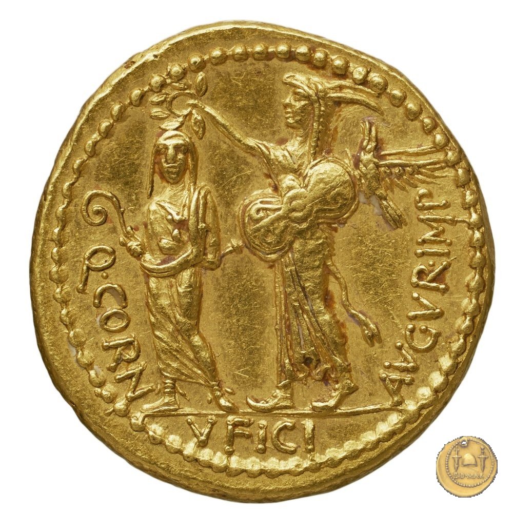 509/3 - aureo Q. Cornuficius Obverse: Busto drappeggiato dell'Africa a destra, con il capo avvolto con la spoglia di elefante. Dietro due lance. Reverse: Q. CORNVFICI. AVGVR. IMP A sinistra Q. Cornuficius con il capo velato; tiene il lituus con la mano destra. A destra Giunone Sospita, con copricapo di pelle caprina e con un corvo sulla spalla; tiene la lancia e lo scudo con la mano sinistra ed incorona con la destra Q. Cornuficius. | |