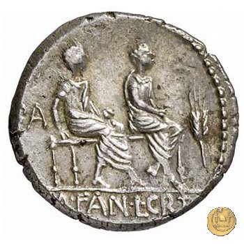 351/1 - denario L. Critonius / M. Fannius Obverse: AED. PL Busto drappeggiato di Cerere a destra, con corona di spighe di grano. Reverse: M. FAN. L. CRT (oppure CR+ oppure CRI) Due figure togate sedute a destra sul subsellium. A sinistra: P. A ; a destra una spiga di grano. |