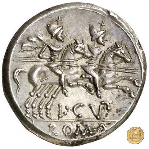 218/1 - denario L. Cupiennius Dritto: Testa di Roma a destra, con elmo attico alato. Dietro una cornucopia; davanti: ![]() ![]() Verso: L. CVP - ROMA I Dioscuri al galoppo verso destra. |