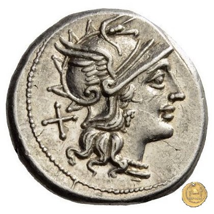 206/1 - denario Spurius Afranius Obverse: Testa di Roma a destra, con elmo attico alato. Dietro: ![]() ![]() Reverse: SAFRA - ROMA La Vittoria su biga verso destra; tiene le redini con la mano sinistra, la frusta con la destra. | |