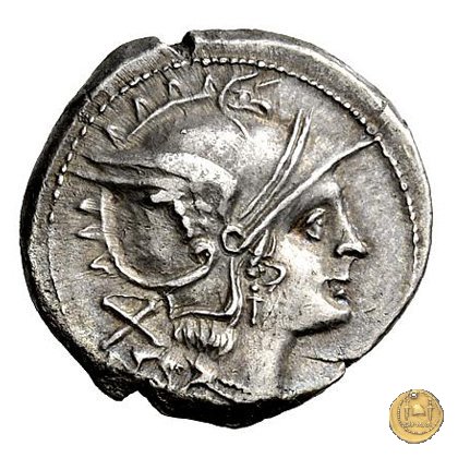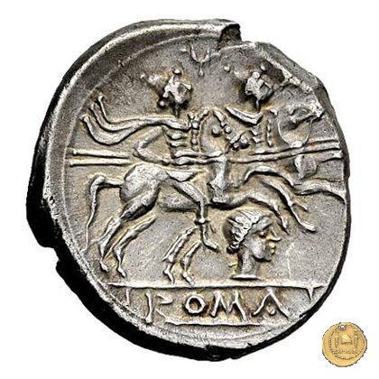 127/1 - denario Horatius Obverse: Testa di Roma a destra, con elmo attico alato. Dietro: ![]() ![]() Reverse: ROMA I Dioscuri a cavallo verso destra. Sotto una testa femminile. |