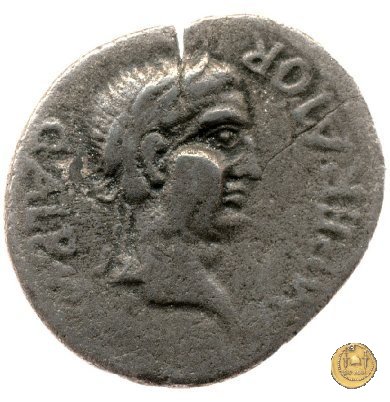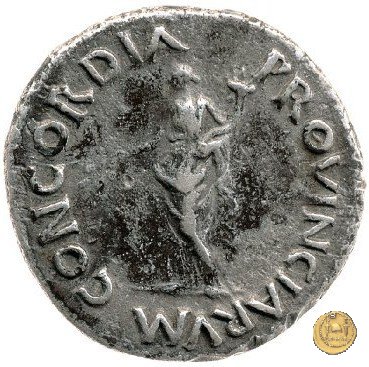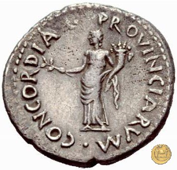 CLM103 Dritto: ![]() GALBA ![]() IMPERATORTesta di Galba, laureata, rivolta verso destra. Globo all'apice del busto. Verso: ![]() CONCORDIA ![]() PROVINCIARVMLa Concordia, drappeggiata e rivolta verso sinistra; nella mano destra un ramo di olivo, nella sinistra una cornucopia. | |