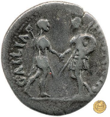 CLM86 Dritto: ![]() GALBA ![]() IMPTesta di Galba, laureata, rivolta verso destra. Globo all'apice del busto. Verso: ![]() GALLIA ![]() HISPANIALa Gallia (sinistra) e la Spagna (destra) che si stringono la mano. La Gallia porta una tunica corta e uno scettro; la Spagna, ha con se uno scudo circolare, un parazonium e una lancia. | |