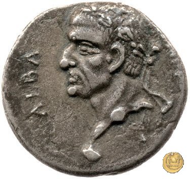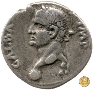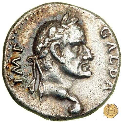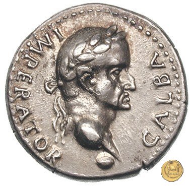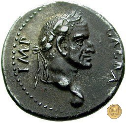CLM75 Dritto: ![]() GALBA IMPERGalba, in abbigliamento militare, che cavalca verso sinistra, con il braccio destro alzato. Verso: ![]() HISPANIABusto della personificazione della Spagna, laureato, drappeggiato e rivolto verso destra; dietro due giavellotti; in basso uno scudo circolare; di fronte due spighe di grano. | |
