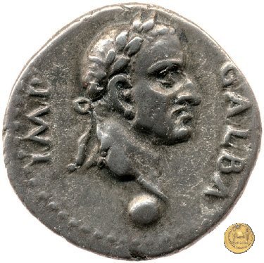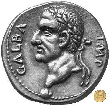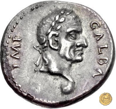 CLM121 Dritto: ↺ SER GALBA IMP CAESAR AVG P M TR P Testa di Galba, laureata, rivolta verso destra. Globo all'apice del busto. Verso: ![]() VIRTVSLa Virtus, vestita di una tunica corta e corazzata, in piedi verso sinistra; nella mano destra una Vittoria su globo, nella sinistra un parazonium. |