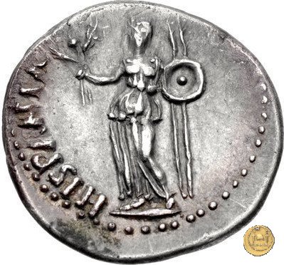 CLM100 Dritto: ![]() GALBA ![]() IMPTesta di Galba, laureata, rivolta verso destra. Globo all'apice del busto. Verso: ![]() VIRTVSLa Virtus, nuda, in piedi e con la testa verso sinistra; nella mano destra un parazonium, nella sinistra una lancia. | |