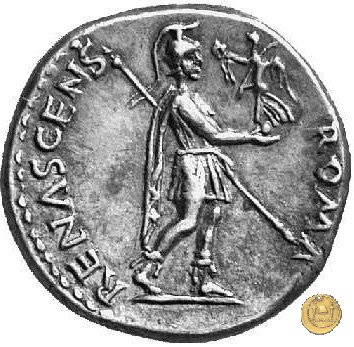 CLM107 Dritto: ![]() GALBA ![]() IMPERATORTesta di Galba, laureata, rivolta verso destra. Globo all'apice del busto. Verso: ![]() ROMA ![]() RENASCRoma, elmata e in abbigliamento militare, che cammina verso destra. Nella mano destra una Vittoria su globo e nella sinistra una lancia. | |