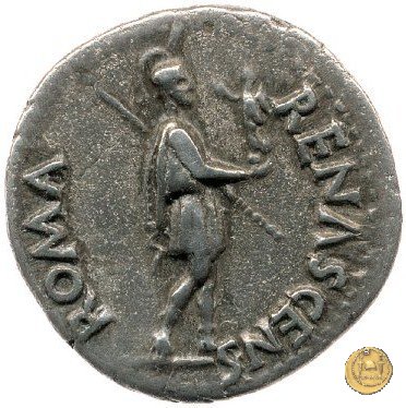 CLM106 Dritto: ![]() GALBA ![]() IMPERATORTesta di Galba, laureata, rivolta verso destra. Globo all'apice del busto. Verso: ![]() ROMA ![]() RENASCRoma, elmata e in abbigliamento militare, che cammina verso destra. Nella mano destra una Vittoria su globo e nella sinistra una lancia. | |
