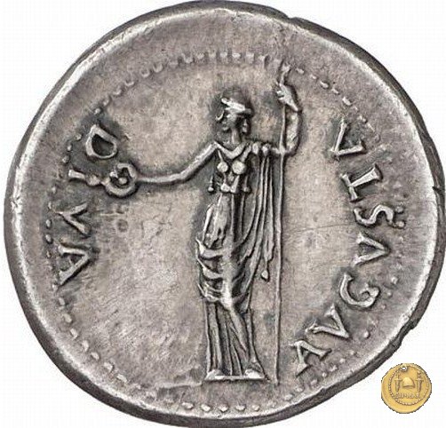 CLM114 Dritto: ↺ SER GALBA IMP CAESAR AVG TR P Testa di Galba, laureata, rivolta verso destra. Globo all'apice del busto. Verso: ![]() DIVA ![]() AVGVSTALivia, drappeggiata e in piedi rivolta verso sinistra. Nella mano destra una patera, nella sinistra un lungo scettro. | |