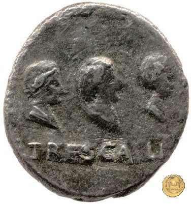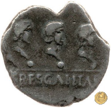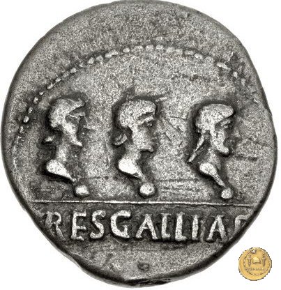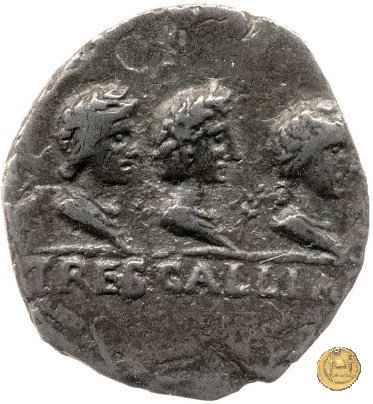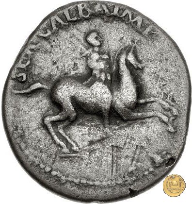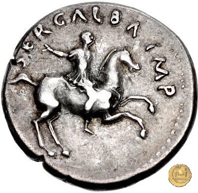 CLM125 Dritto: ![]() SER GALBA IMPGalba, in abbigliamento militare, che cavalca verso destra; nella mano destra, un giavellotto. Verso: → TRES GALLIAE (esergo) Tre piccoli busti femminili, uno di seguito all'altro, drappeggiati e rivolti verso destra; All'apice di ogni busto, un globo. | |