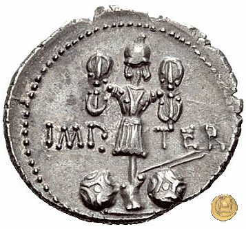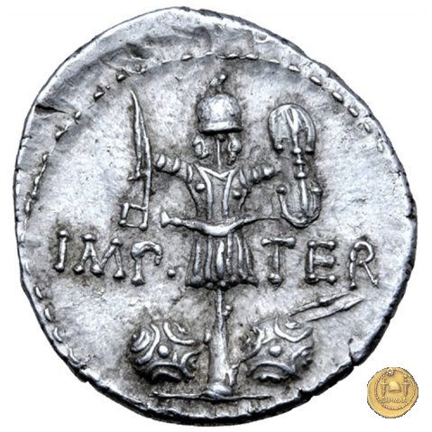 536/1 - denario M. Antonius Obverse: M. ANT. AVGVR. III. VIR. R. P. C Testa di Marc'Antonio a destra. Reverse: IMP TER Trofeo d'armi con corazza, elmo, spada curva e scudo bilobato; alla cintura della corazza è appesa una spada nel fodero. Alla base due scudi rotondi e due lance. | |