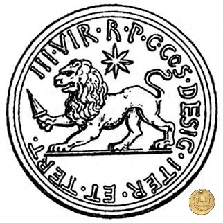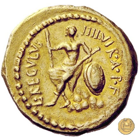 494/2 - aureo M. Antonius / L. Livineius Regulus Obverse: M. ANTONIVS. III. VIR. R. P. C Testa di Marc'Antonio a destra. Reverse: L. REGVLVS - III. VIR. A. P. F Ercole seduto frontalmente su delle rocce, con la spoglia leonina sulle ginocchia; tiene la lancia con la mano destra, la spada con la sinistra. A destra uno scudo ornato con la testa della Gorgone. | |