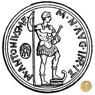 494/8 - aureo M. Antonius / L. Mussidius Longus Obverse: M. ANTONIVS. III. VIR. R. P. C Testa di Marc'Antonio a destra. Reverse: L. MVSSIDIVS. T. F. LONGVS. IIII. VIR. A. P. F Marte, in nudità eroica, stante a destra, con elmo corinzio; tiene la spada con la mano sinistra, la lancia con la destra; poggia il piede sinistro su uno scudo. | |