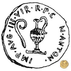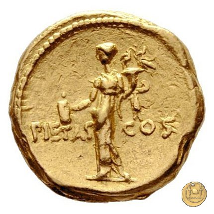 516/4 - aureo M. Antonius Obverse: M. ANTONIVS. IMP. III. VIR. R. P. C Testa di Marc'Antonio a destra. Dietro il lituus. Reverse: PIETAS - COS La Pietas stante a sinistra; tiene con la mano destra un turibulum acceso, con la sinistra una cornucopia sulla quale ci sono due cicogne. | |