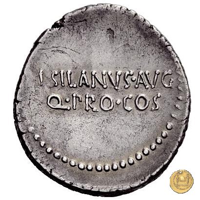 542/1 - denario M. Antonius / M. Iunius Silanus Obverse: ANTON. AVG. IMP. III. COS. DES. III. III. V. R. P. C Testa di Marc'Antonio a destra. Reverse: M. SILANVS. AVG / Q. PRO. COS • | |