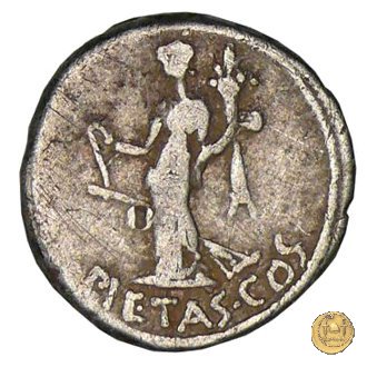 516/5 - denario M. Antonius Obverse: M. ANTONIVS. IMP. III. VIR. R. P. C Testa di Marc'Antonio a destra. Dietro il lituus. Reverse: PIETAS - COS La Pietas stante a sinistra; tiene con la mano destra un turibulum acceso, con la sinistra una cornucopia sulla quale ci sono due cicogne. | |