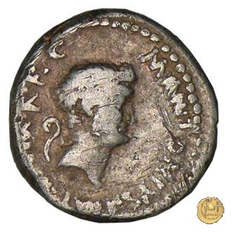 520/1 - denario M. Antonius Obverse: Testa di Marc'Antonio a destra. Dietro il lituus. Reverse: M. ANT. IMP - III. VIR. R. P. C Caduceo alato tra due cornucopie con nastri su globo. | |