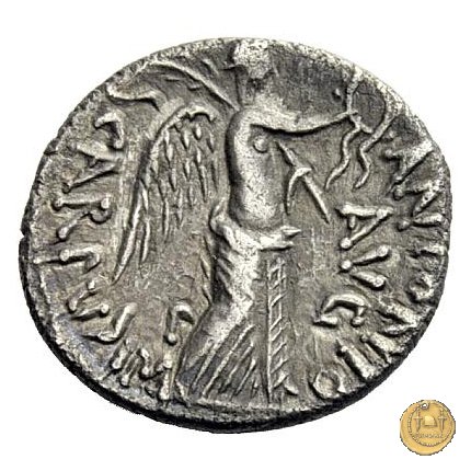 546/2 - denario M. Antonius / L. Pinarius Scarpus Obverse: M. ANTO. COS. (dietro) III. IMP. IIII (davanti) Testa di Giove Ammon a destra. Reverse: ANTONIO / AVG - SCARPVS. IM / P La Vittoria stante a destra; tiene la corona vittata con la mano destra e regge con la sinistra un ramo di palma sulla spalla. | |