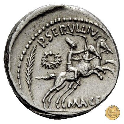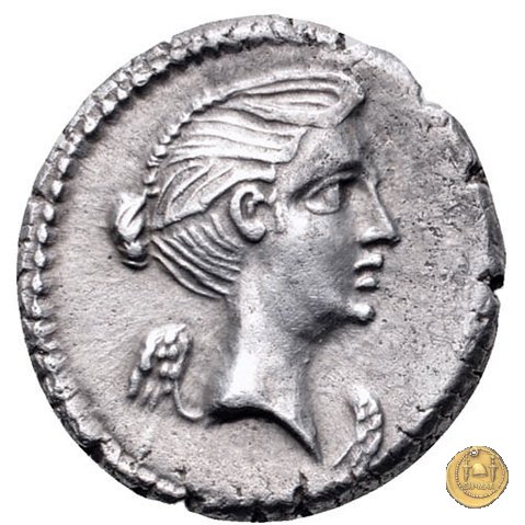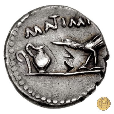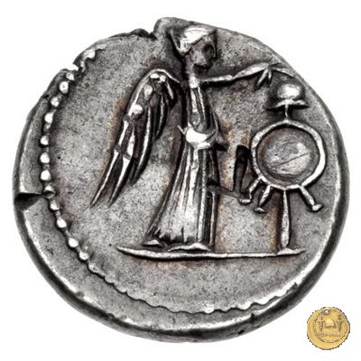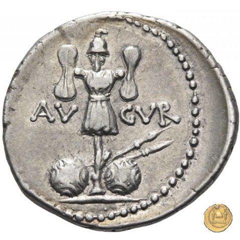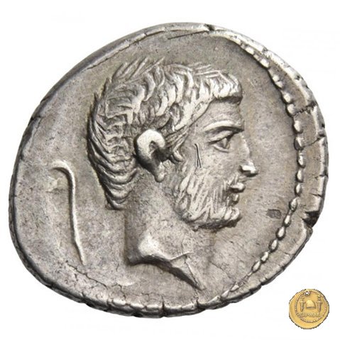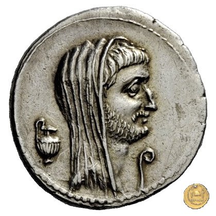480/22 - denario M. Antonius / P. Sepullius Macer Obverse: Testa barbata e velata di Marc'Antonio a destra. Davanti il lituus; dietro una brocca. Reverse: P. SEPVLLIVS - MACER Desultor conduce due cavalli al galoppo verso destra; con berretto conico, tiene le redini con la mano sinistra, la frusta con la destra. Dietro un ramo di palma e una corona. | |