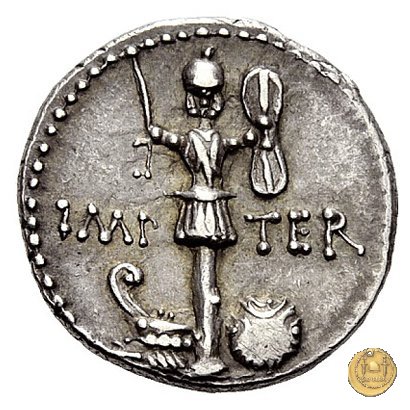536/2 - denario M. Antonius Obverse: M. ANT. AVGVR. III. VIR. R. P. C Testa di Marc'Antonio a destra. Reverse: IMP TER Trofeo d'armi con corazza, elmo, spada curva e scudo bilobato; alla cintura della corazza è appesa una spada nel fodero. Alla base una prua di nave e uno scudo rotondo. | |