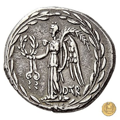545/1 - denario M. Antonius / D. Turullius Obverse: M. ANTONIVS. AVG. IMP. IIII. COS. TERT. III. VIR. R. P. C Testa di Marc'Antonio a destra. Reverse: D. TVR La Vittoria stante a sinistra; tiene la corona vittata con la mano destra e regge con la sinistra un ramo di palma sulla spalla. Una corona d'alloro come contorno. | |