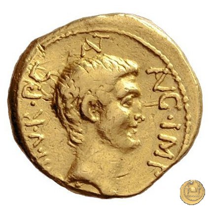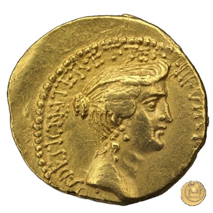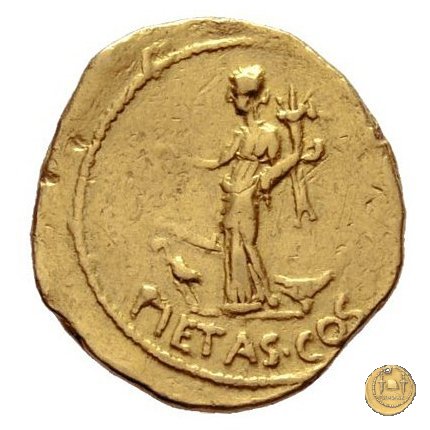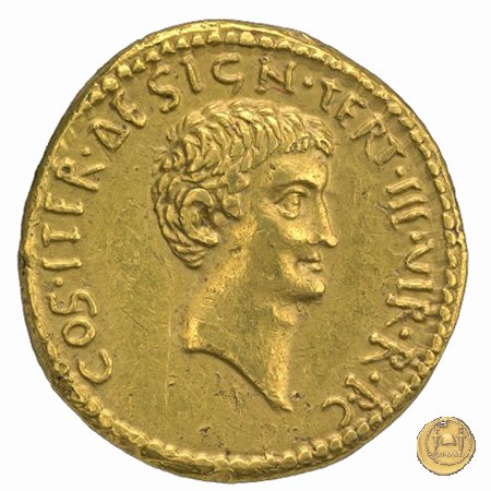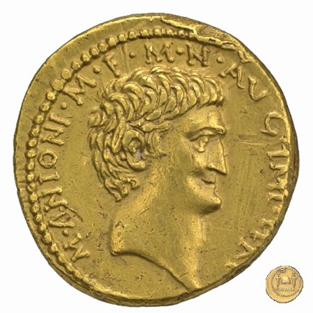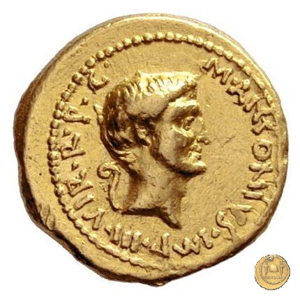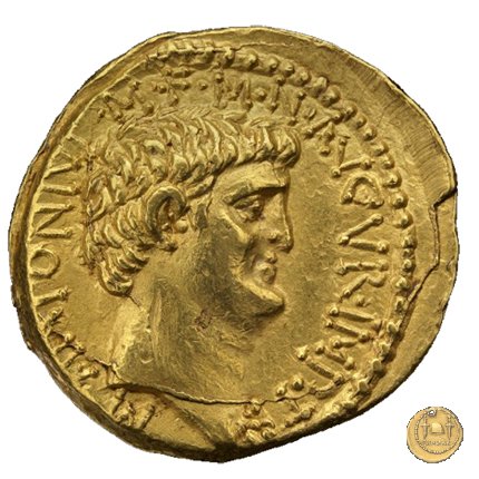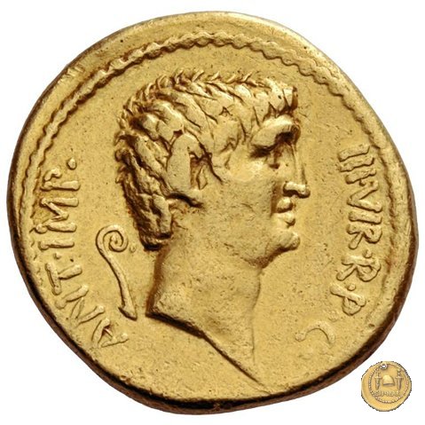 494/5 - aureo M. Antonius / P. Clodius M.f. Obverse: M. ANTONIVS. III. VIR. R. P. C Testa di Marc'Antonio a destra. Reverse: P. CLODIVS. M. F. IIII. VIR. A. P. F Figura maschile alata stante a sinistra, con corona radiata e con arco e faretra sulle spalle; tiene il caduceo con la mano destra, la cornucopia con la sinistra; poggia il piede destro sul globo. A destra uno scudo, a sinistra un'aquila sul cippus. | |