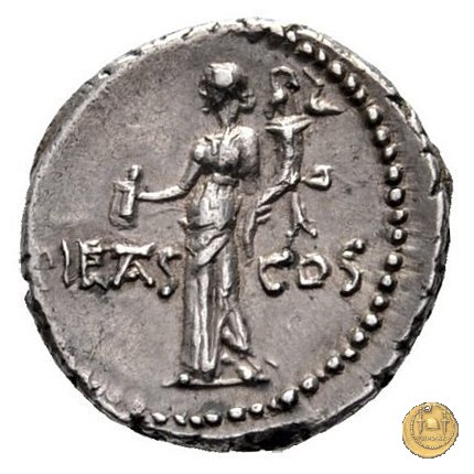 494/32 - denario M. Antonius / C. Vibius Varus Obverse: Testa barbata di Marc'Antonio a destra. Reverse: C. VIBIVS - VARVS La Fortuna stante a sinistra; tiene la Vittoria con la mano destra, la cornucopia con la sinistra. | |