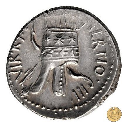 539/1 - denario M. Antonius Obverse: ANTONIVS. AVGVR. COS. DES. ITER. ET. TERT Testa di Marc'Antonio a destra. Reverse: IMP. TERTIO. III. VIR. R. P. C Tiara armena decorata con stelle. Dietro un arco e una freccia incrociati. | |