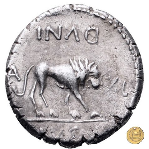 489/5 - quinario M. Antonius Obverse: Busto della Vittoria a destra. Reverse: LVGV - DVNI Leone a destra. A sinistra: A ; a destra: XL | |