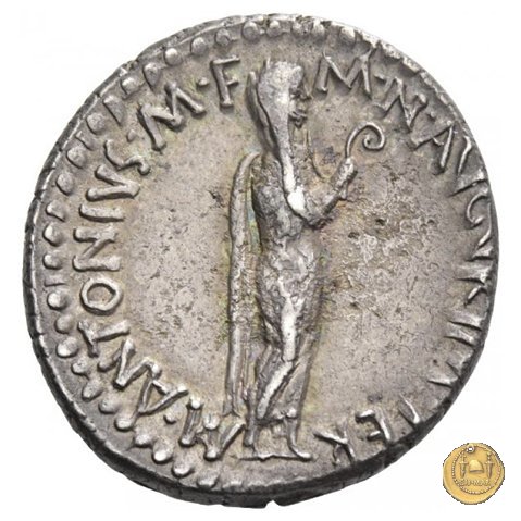 545/2 - denario M. Antonius Obverse: M. ANTONIVS. AVG. IMP. IIII. COS. TERT. III. VIR. R. P. C Testa di Marc'Antonio a destra. Reverse: La Vittoria stante a sinistra; tiene la corona vittata con la mano destra e regge con la sinistra un ramo di palma sulla spalla. Una corona d'alloro come contorno. | |