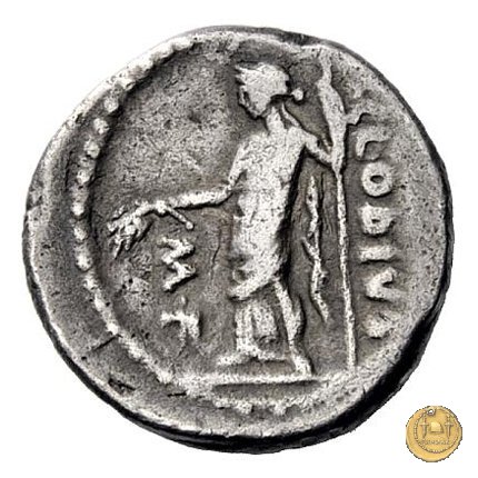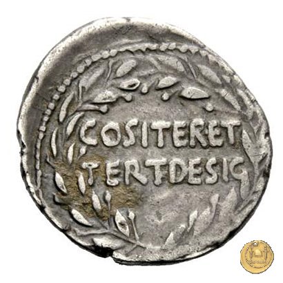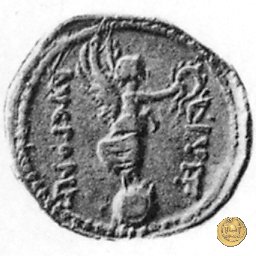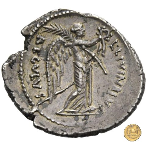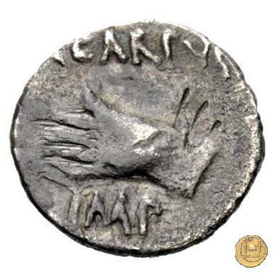 494/25 - denario C. Iulius Caesar Octavianus / L. Livineius Regulus Dritto: C. CAESAR - III. VIR. R. P. C Testa di Ottaviano a destra. Verso: L. LIVINEIVS - REGVLVS La Vittoria stante a destra; tiene con la mano destra la corona e regge con la sinistra un ramo di palma sulla spalla. | |