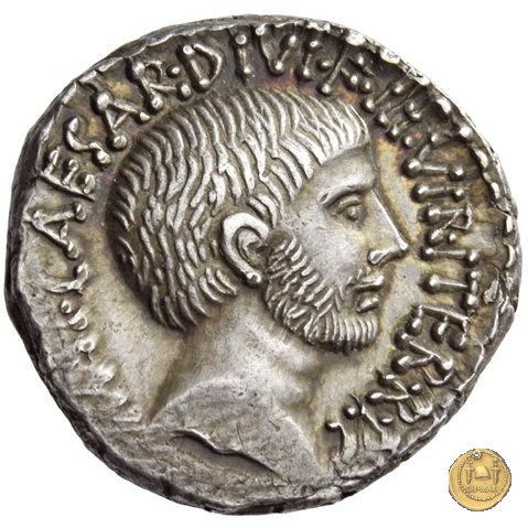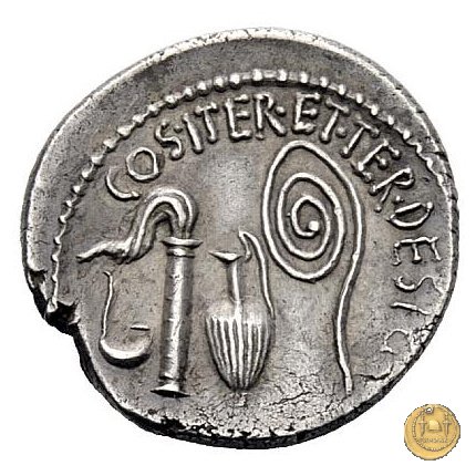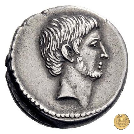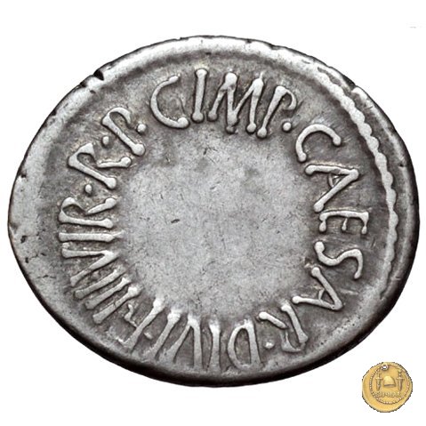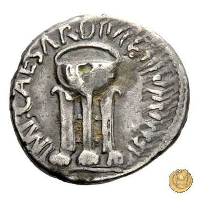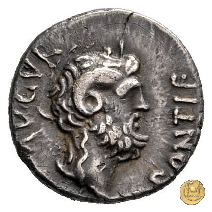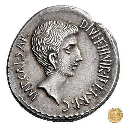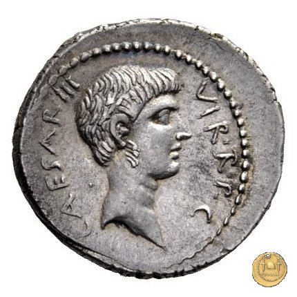 538/1 - denario C. Iulius Caesar Octavianus Dritto: IMP. CAESAR. DIVI. F. III. VIR. ITER. R. P. C Testa di Ottaviano a destra. Verso: COS. ITER. ET. TER. DESIG Simpulum, aspergillum, brocca e lituus. | |