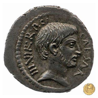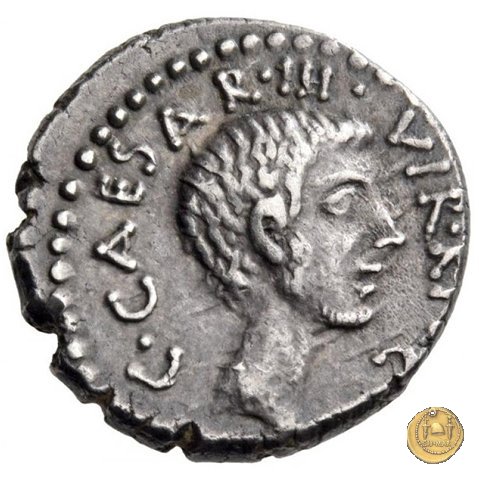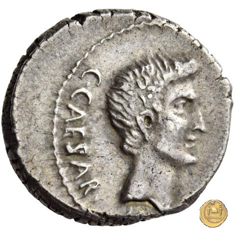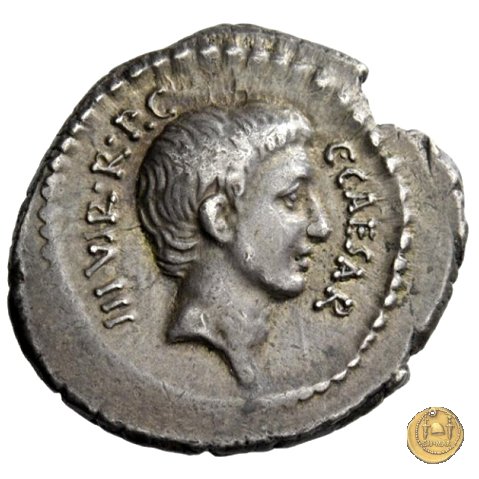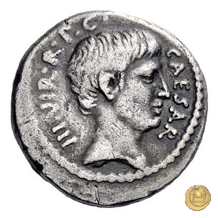 490/4 - denario C. Iulius Caesar Octavianus Dritto: C. CAESAR. III. VIR. R. P. C Testa di Ottaviano a destra. Verso: Testa laureata di Cesare a destra. | |