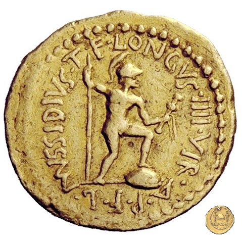 494/9 - aureo C. Iulius Caesar Octavianus / L. Mussidius Longus Dritto: C. CAESAR. III. VIR. R. P. C Testa di Ottaviano a destra. Verso: L. MVSSIDIVS. T. F. LONGVS. IIII. VIR. A. P. F Marte, in nudità eroica, stante a destra, con elmo corinzio; tiene la spada con la mano sinistra, la lancia con la destra; poggia il piede sinistro su uno scudo. | |